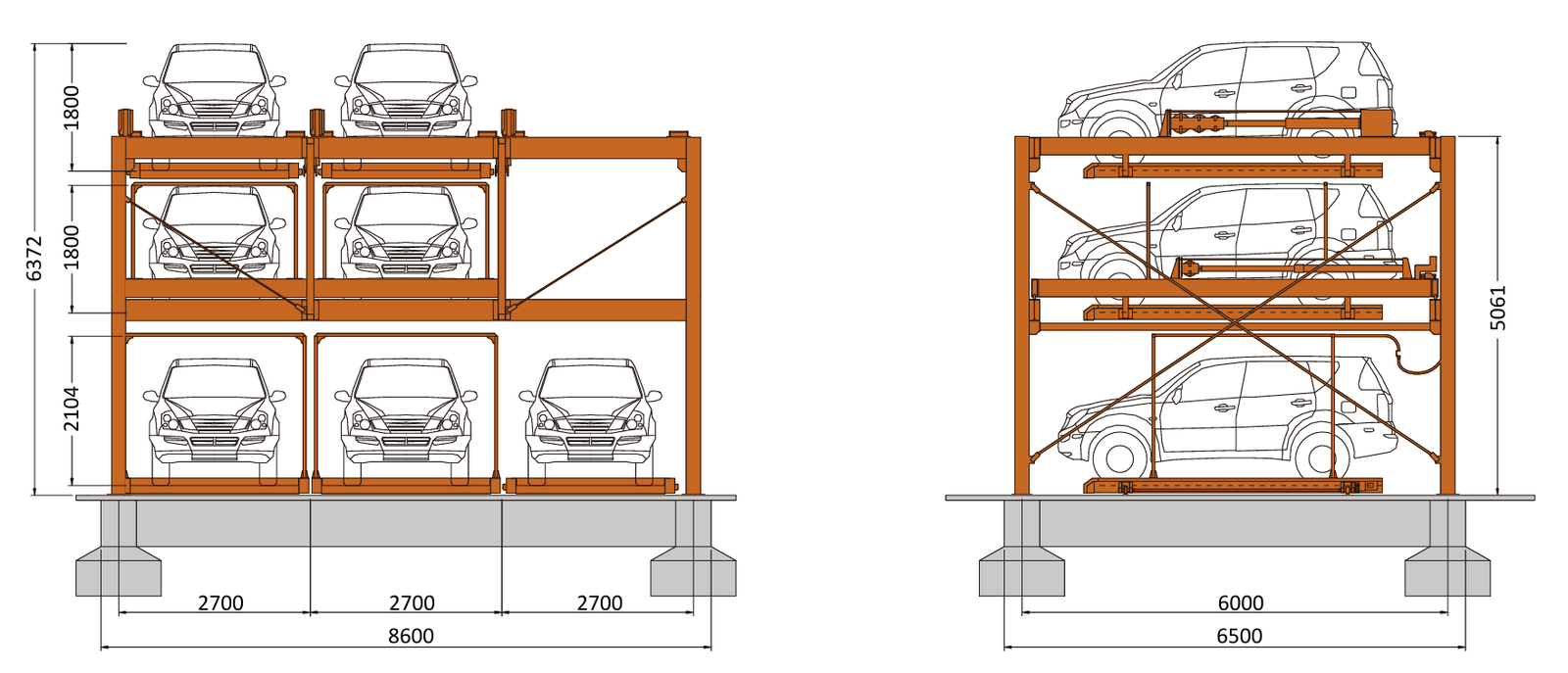 2 to 5 levels, up to 26 cars per system, and 3 to 10 parking bays